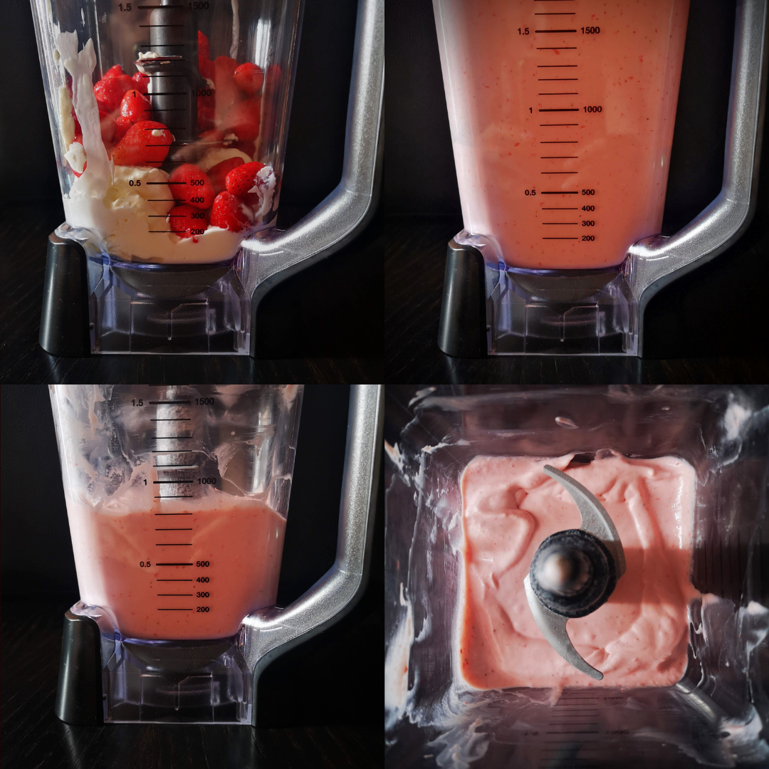 Блендирайте млечната сметаната заедно с почистените ягоди и розовата вода. Ако ягодите не са сладки и предпочитате може да добавите подсладител по избор.500 г заквасена сметана, 250 г пресни ягоди