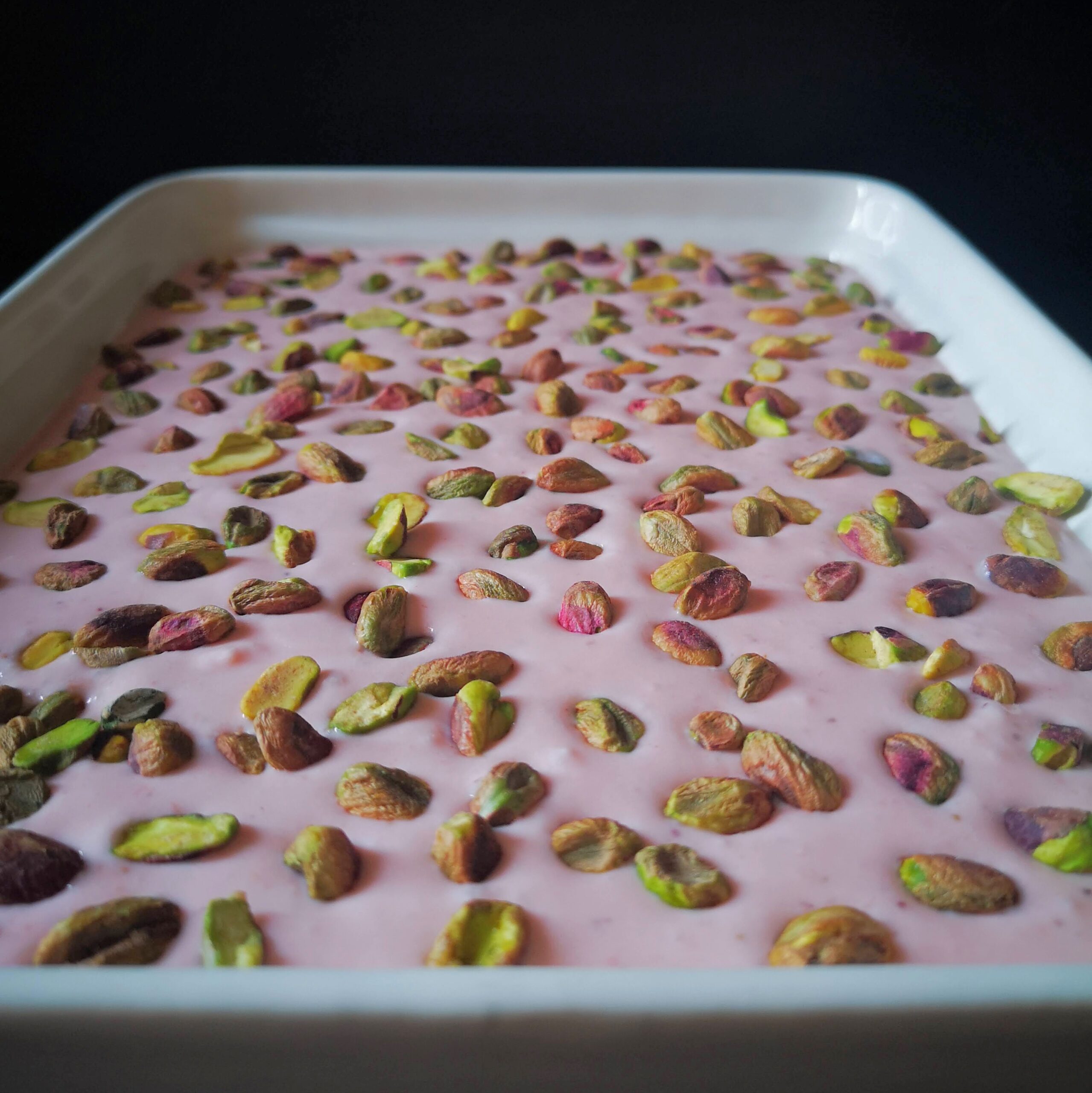 Комбинацията между рози и шамфъстък е просто задължителна. А всъщност за да разчупите текстурата може да добавите и други ядки, но шам фъстък и розова вода е класика.