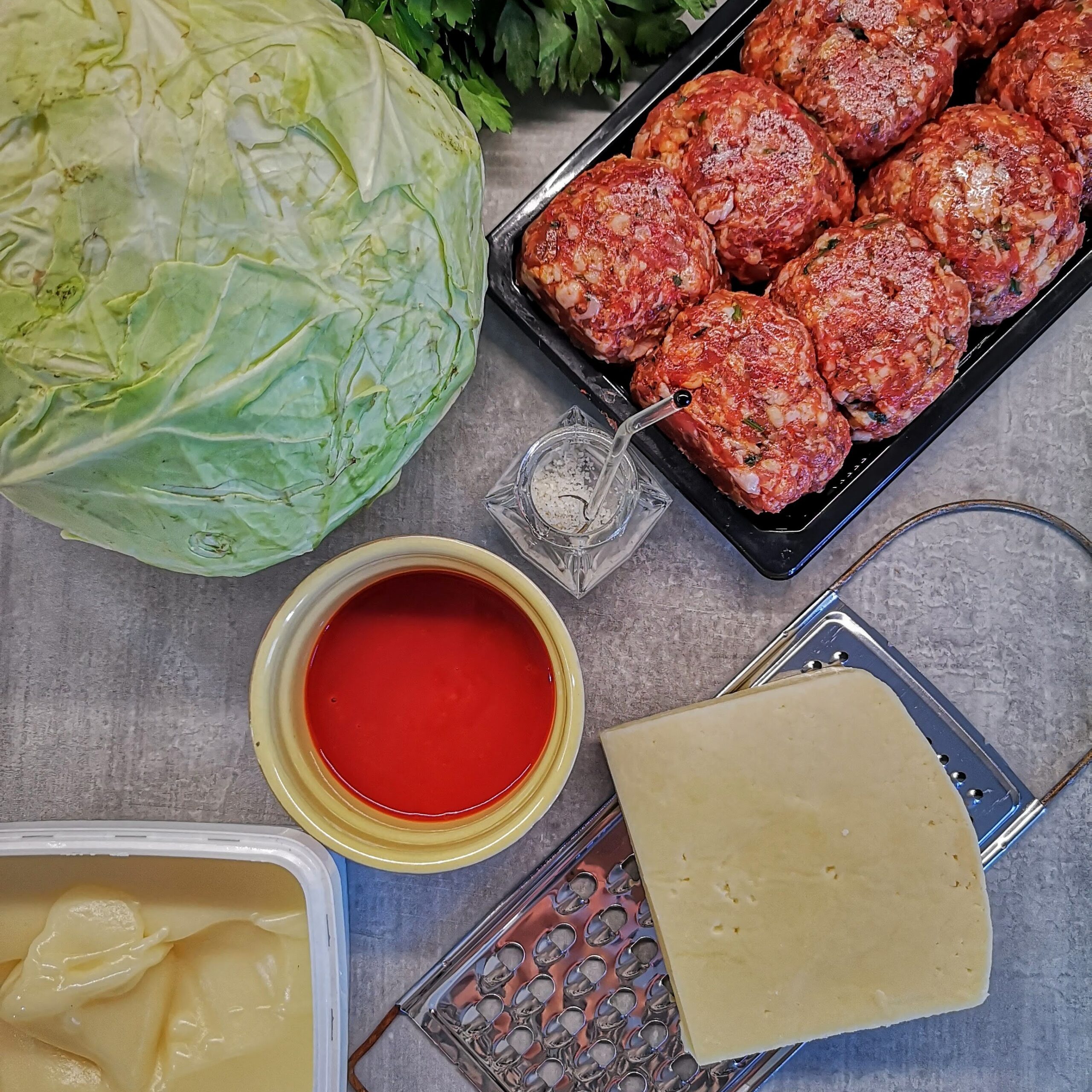 Нарежете зелето на филии. Намазнете с патешка мас и овкусете със сол. Намажете всяка зелева филия с доматено пюре. Сплескайте кюфтетата и ги положете върху зелето. Настържете зрялото сирене отгоре. Печете 30 минути.1 бр. зеле, 8 бр. кюфтета, 100 мл доматено пюре, 20 г патешка мас, 80 г овче сирене